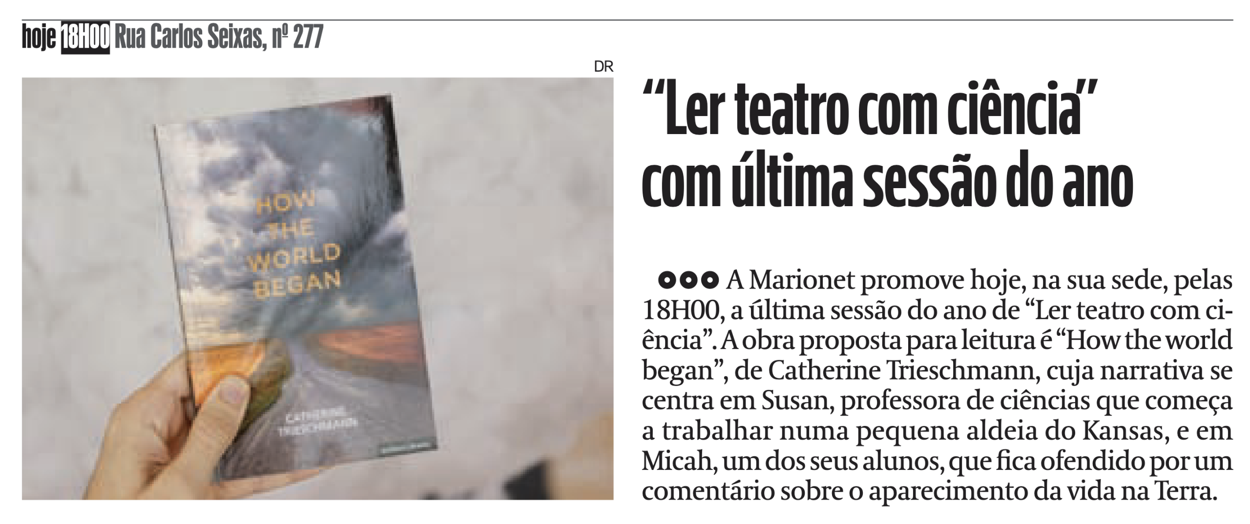 A 28.ª sessão de Ler Teatro com Ciência acontece no dia 19 de novembro, pelas 18 horas, no espaço da Marionet (Rua Carlos Seixas, 277).